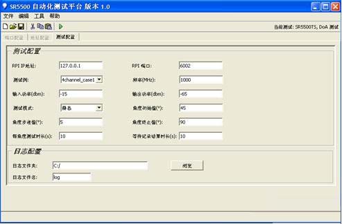 如圖4.2.1所示,設置IP地址和端口是為與SR5500 Testkit通信,然后就可以選擇信道模型、測試頻點、輸入輸出功率,選擇靜態(tài)或動態(tài)。如果是靜態(tài),則只有角度初始值生效,如果是動態(tài),則按照角度步進值和角度終止值自動執(zhí)行,為了測試穩(wěn)定性和記錄的方便,軟件還提供了每個測試點時長和等待記錄結(jié)果的時長: